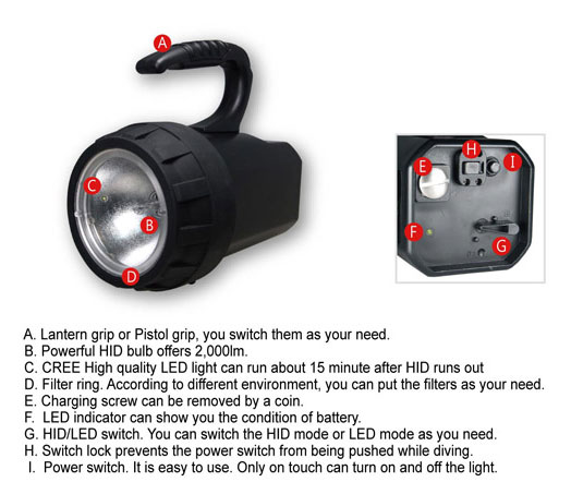 照度約2.000ルーメンという驚愕の明るさを提供するHIDに加え5Wの白色LEDが装備されています。格段の明るさに加えIP68という最高クラスの防塵・防水機能を有しています。連続点灯時間:約2.3hrs、照度:約2.000 lm